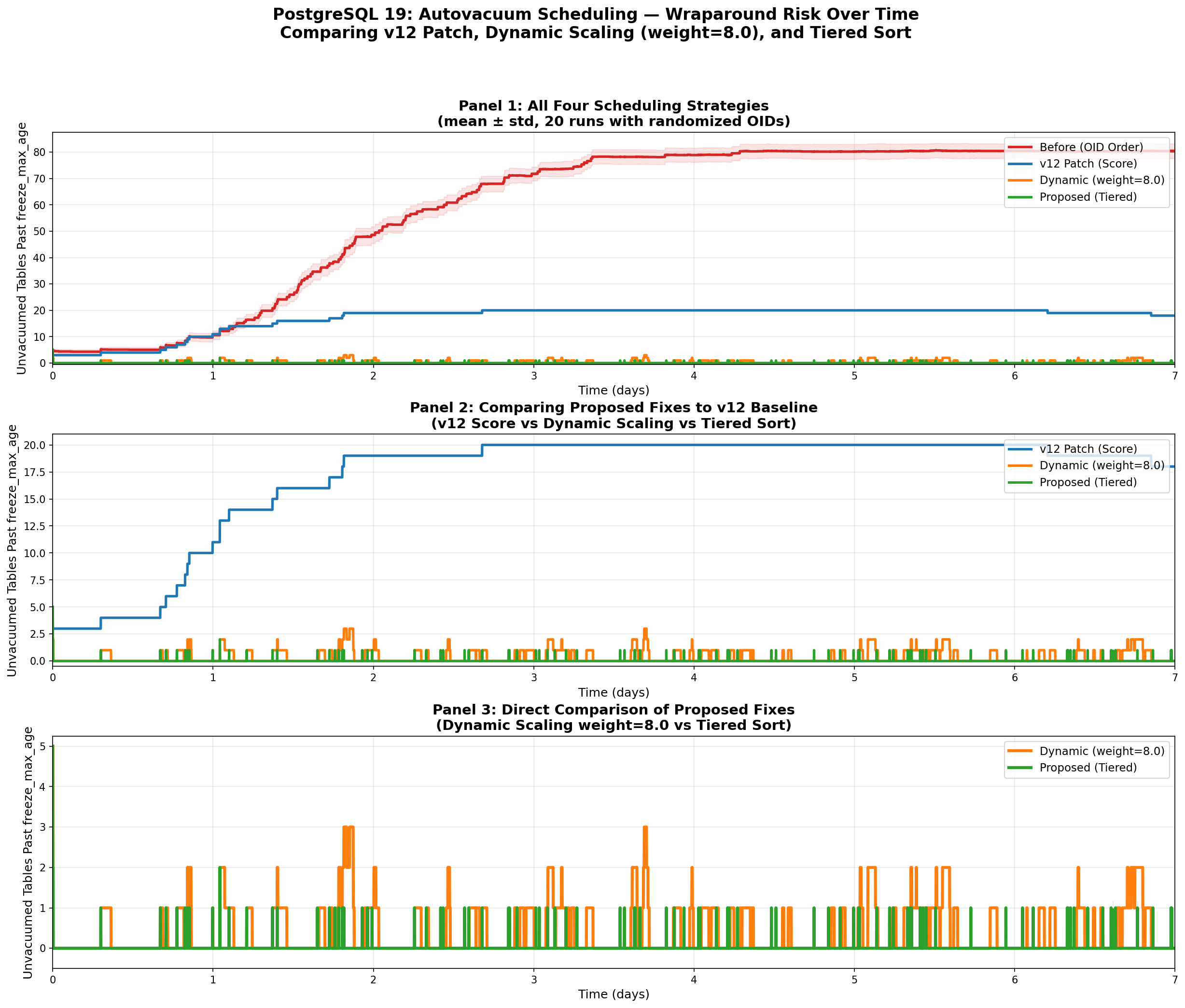 I tried to model this in a stress test with 100 tables competing for 3 workers over 7 days, the v12 score-based scheduler actually performed worse than OID order for wraparound exposure: