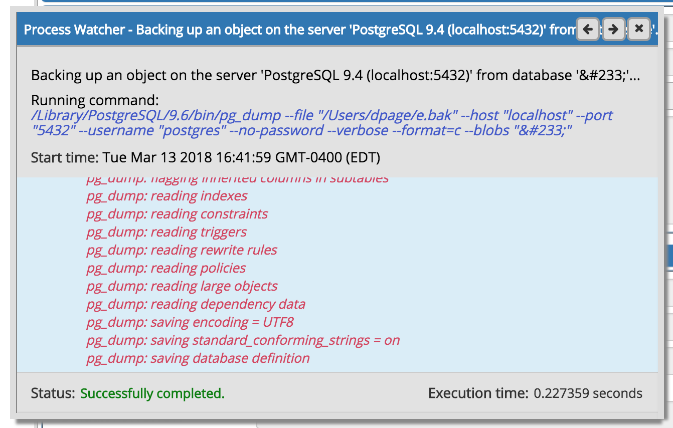 >>> --file "/Users/dpage/foo.dmp" --host "127.0.0.1" --port "5432" --username
